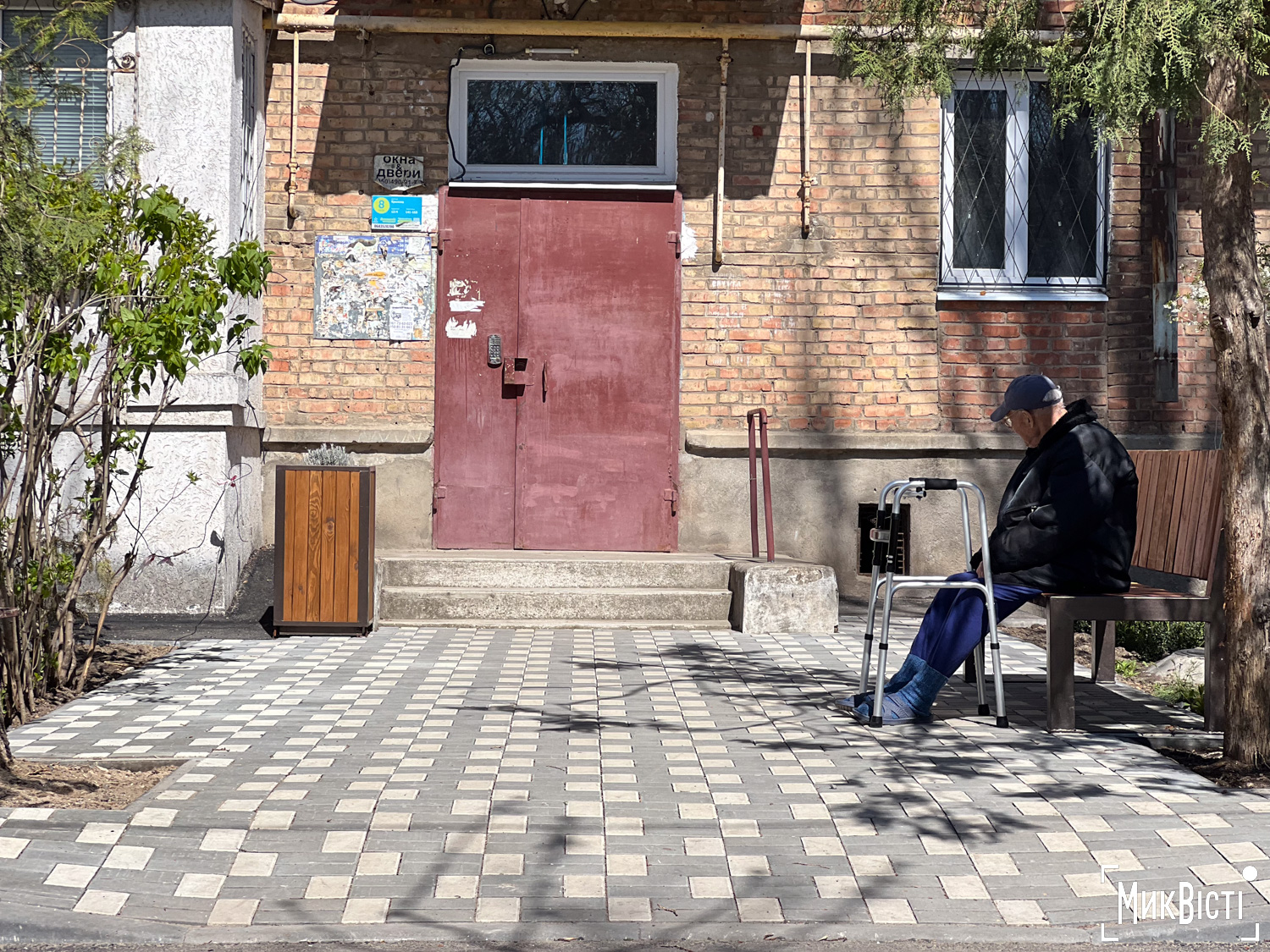 Мешканець мікрорайону Ліски відпочиває на оновленій прибудинковій території, квітень 2025 року, фото: «МикВісті»Що уявляє кожен з нас, коли чує слово «відновлення»? Зазвичай — щось масштабне, грандіозне, з яскравою стрічкою на відкритті. Але в реальності відновлення має багато форм. І часто починається з простого — забити вибите обстрілами вікно, вивезти уламки чи залити щебенем вирву біля під’їзду. Цим у Миколаєві займаються комунальні служби.