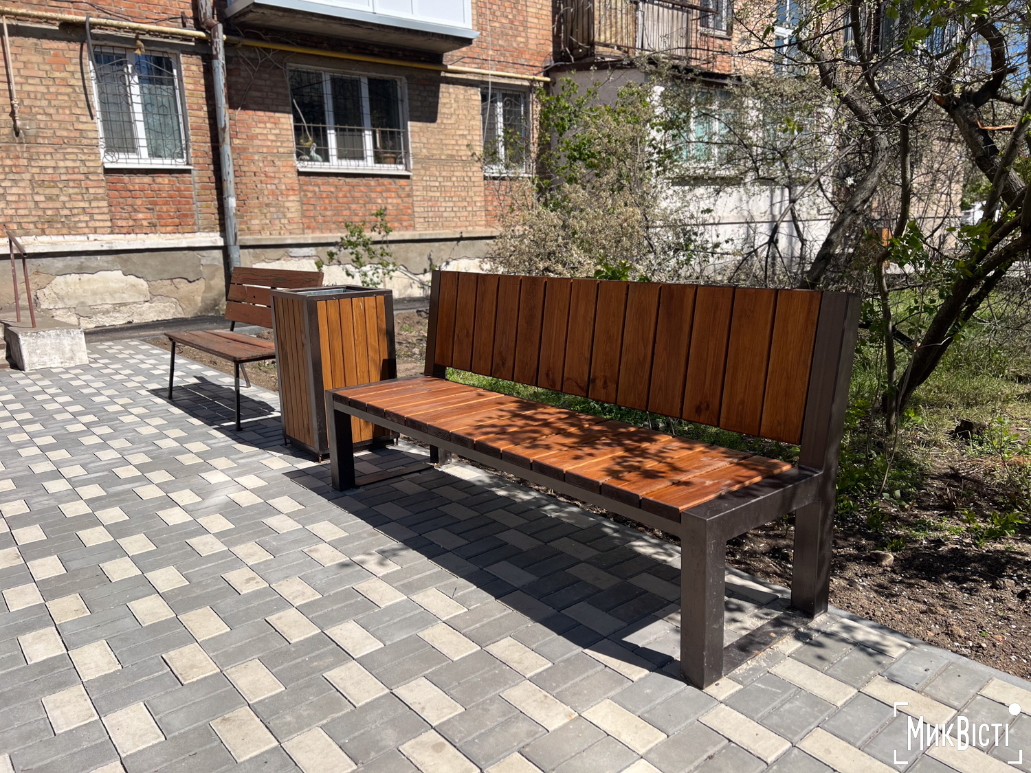 Нова лавка та урна біля багатоквартирного будинку у мікрорайоні Ліски, квітень 2025 року, фото: «МикВісті»