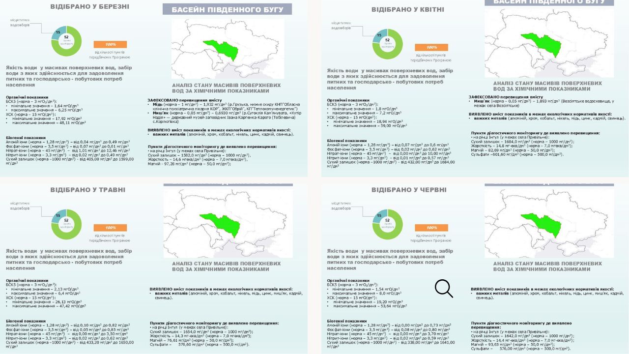 Якщо проаналізувати дослідження проб води за чотири місяці (березень, квітень, травень, червень) то видно, що у більшості точок якість води стабільна: важкі метали (Al, Cr, Co, Ni, Cu, Zn, Cd, Pb) — у межах нормативів, біогенні показники — низькі або помірні.