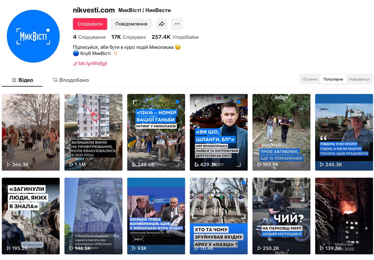 Хоча відеоконтент у ТікТок онлайн-медіа періодично публікує. Це відеонарізки з субтитрами, якими журналісти перепаковують матеріали зі стрічки новин у відеоформат. Наприклад, відео про ситуацію у місцевому комунальному басейні, де обвалилась плитка, або новина про запуск тролейбусу у віддалений район Миколаєва.
