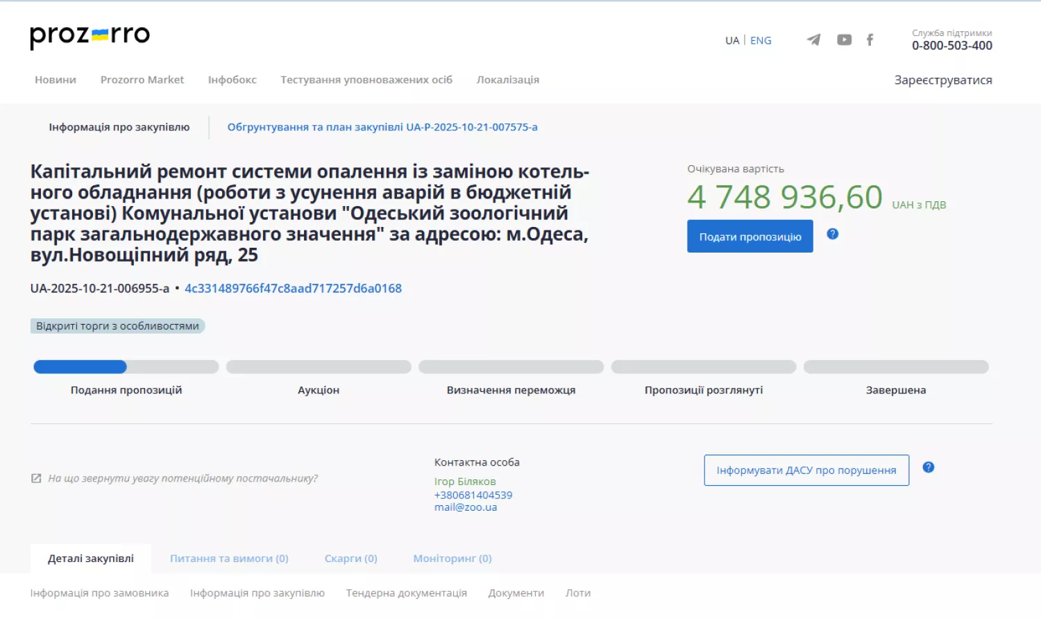 Замовником виступає комунальна установа «Одеський зоологічний парк загальнодержавного значення».
