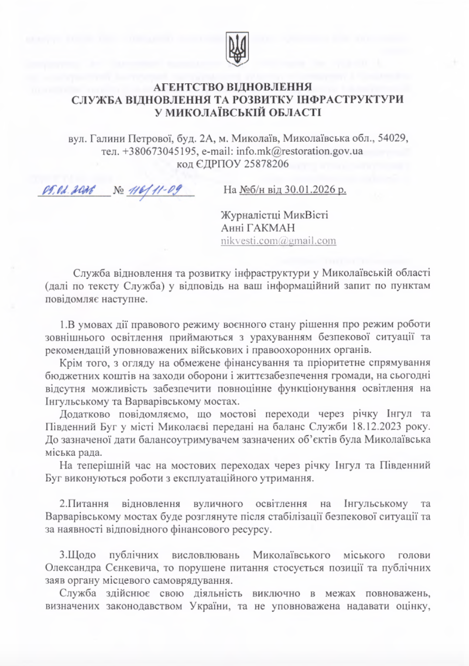 Про це «МикВісті» повідомили у Службі відновлення та розвитку інфраструктури Миколаївської області у відповідь на інформаційний запит.