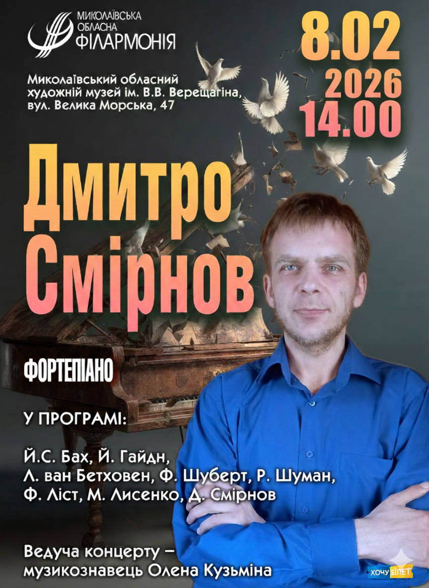 8 лютого, неділя, 14:00 — концерт Дмитра Смирнова, фортепіано