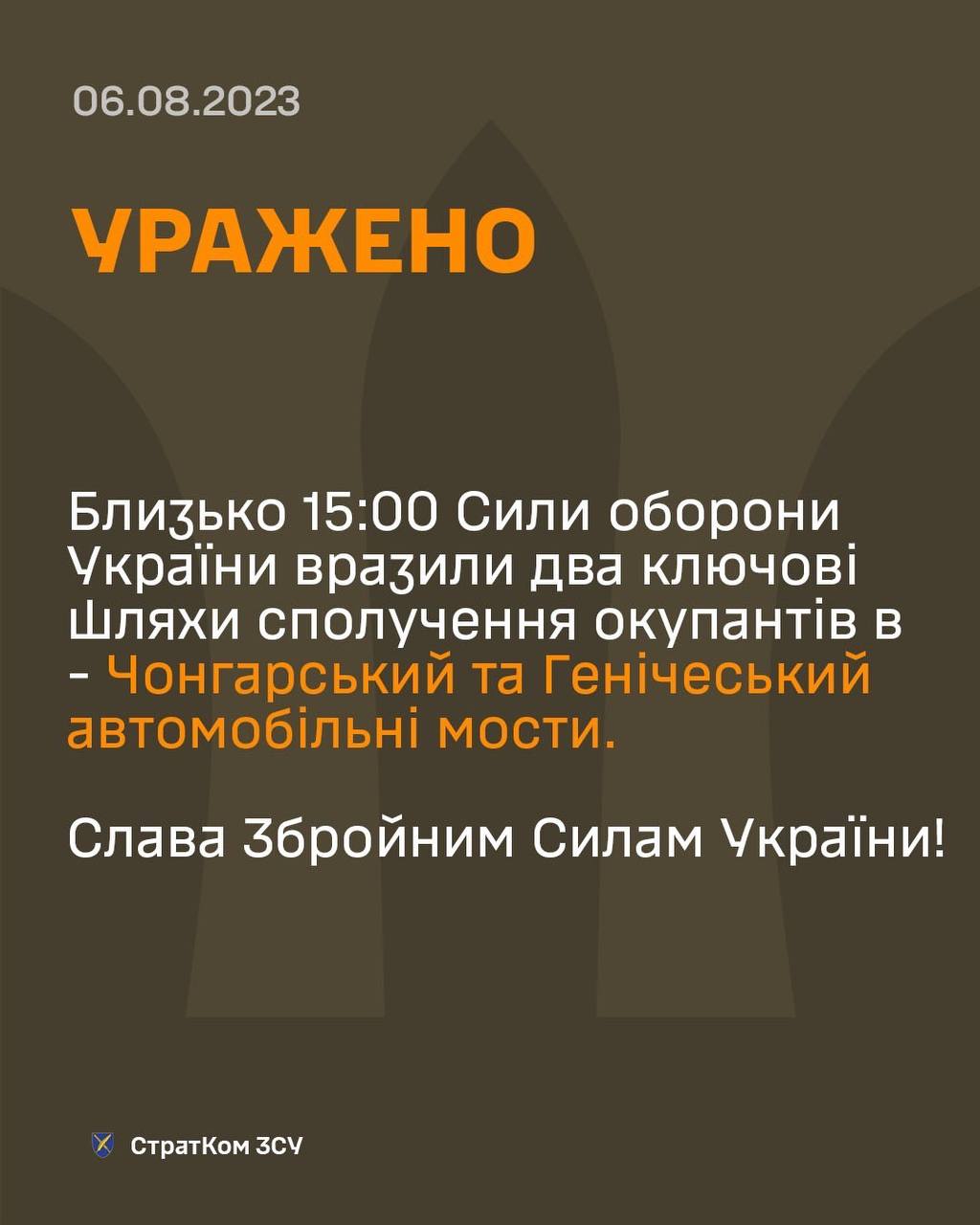 Зазначається, що близько 15:00 Сили оборони України вразили два ключові шляхи сполучення окупантів — Чонгарський та Генічеський автомобільні мости.