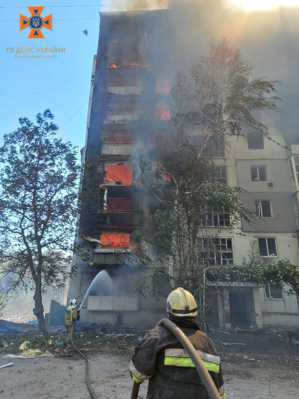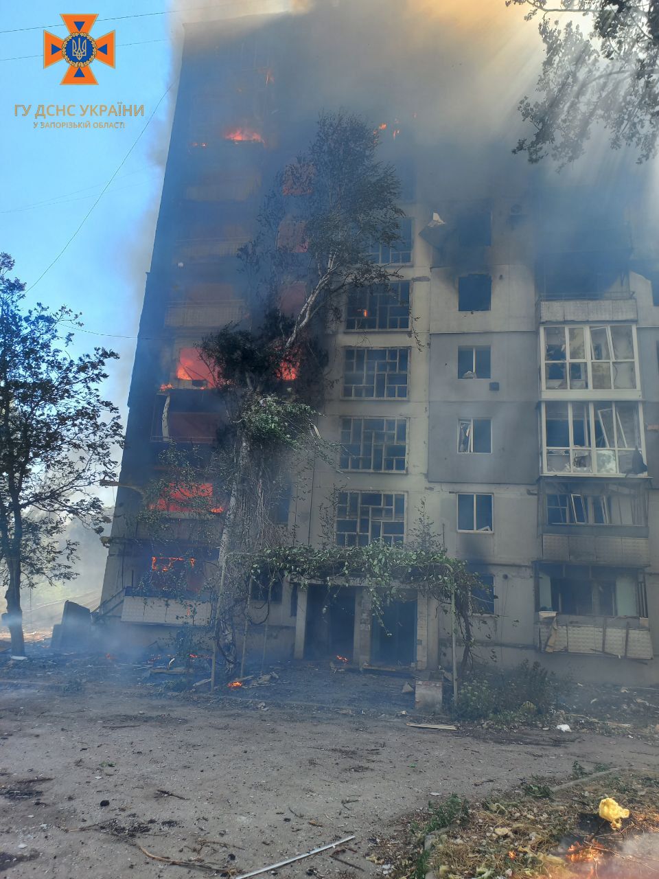 «6 серпня внаслідок обстрілу виникла пожежа в дев’ятиповерховому житловому будинку в Оріхові. Пожежа охопила квартири з першого по дев’ятий поверх багатоповерхівки на площі 1400 кв.м», — йдеться в повідомленні.