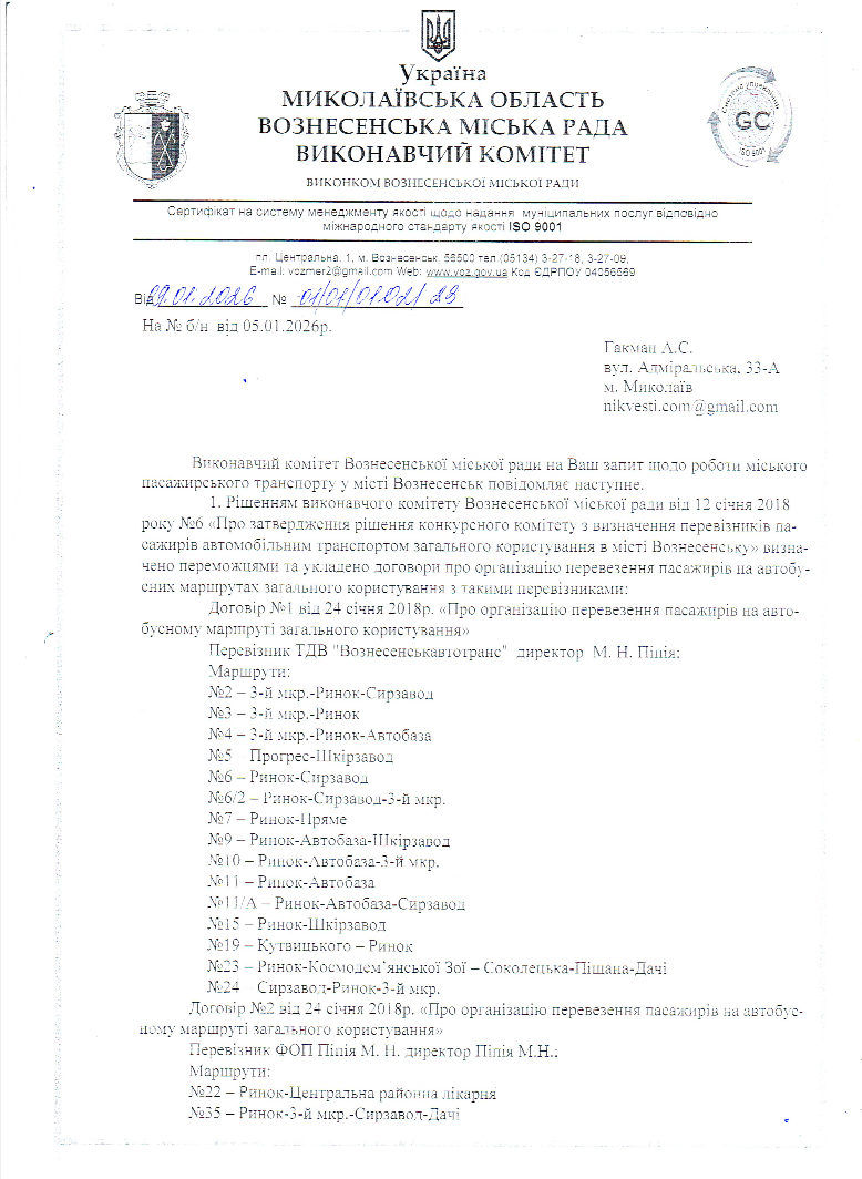 Додамо, що на офіційному сайті Вознесенської міської ради є перелік перевізників та маршрутів у місті. Серед них: