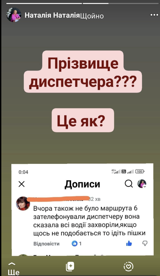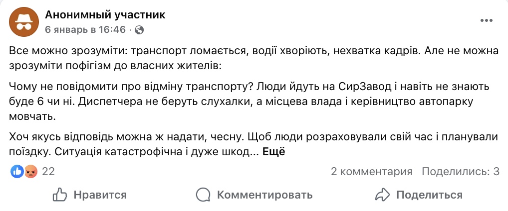 — Вони трохи «зашевелилися», але всі проблеми списують на відсутність водіїв. А що ви зробили, щоб водії були? Практично нічого: немає офіційного оформлення, немає бронювання, гідної зарплати, ремонти доводиться робити за власний кошт — купа різних «але-але-але». 12 січня ситуація виглядала доволі добре, у період з 13 по 16 січня мій маршрут був, але у середу зняли великий автобус і пустили малий, через що люди на декількох зупинках просто не влізли. Автобус навіть не ставав на зупинках. Чула також, що інших маршрутів або взагалі не було, або вони працювали з великими перебоями, — розповіла Наталя Щур.