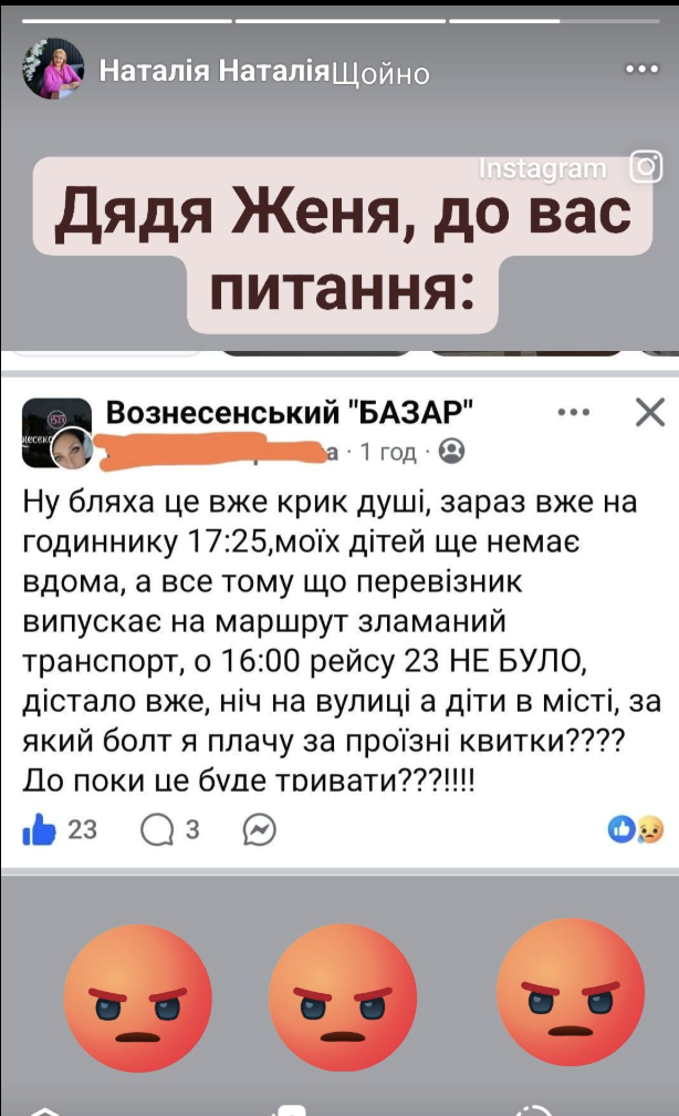 Мешканці Вознесенська скаржаться на перебої міського транспорту 6 січня, скриншот з групи Маршрутки Вознесенська. Громадський транспортМісцева жителька Наталія Щур розповіла «МикВісті», що ситуація з транспортом покращилася, але через переповнені автобуси пасажири іноді не могли в них потрапити.