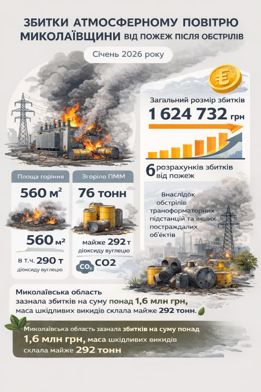 У січні на Миколаївщині через пожежі, спричинені російськими обстрілами, в атмосферу потрапили сотні тонн забруднюючих речовин. Екологи підрахували, що шкода повітрю за один місяць становить 1,6 мільйона гривень.