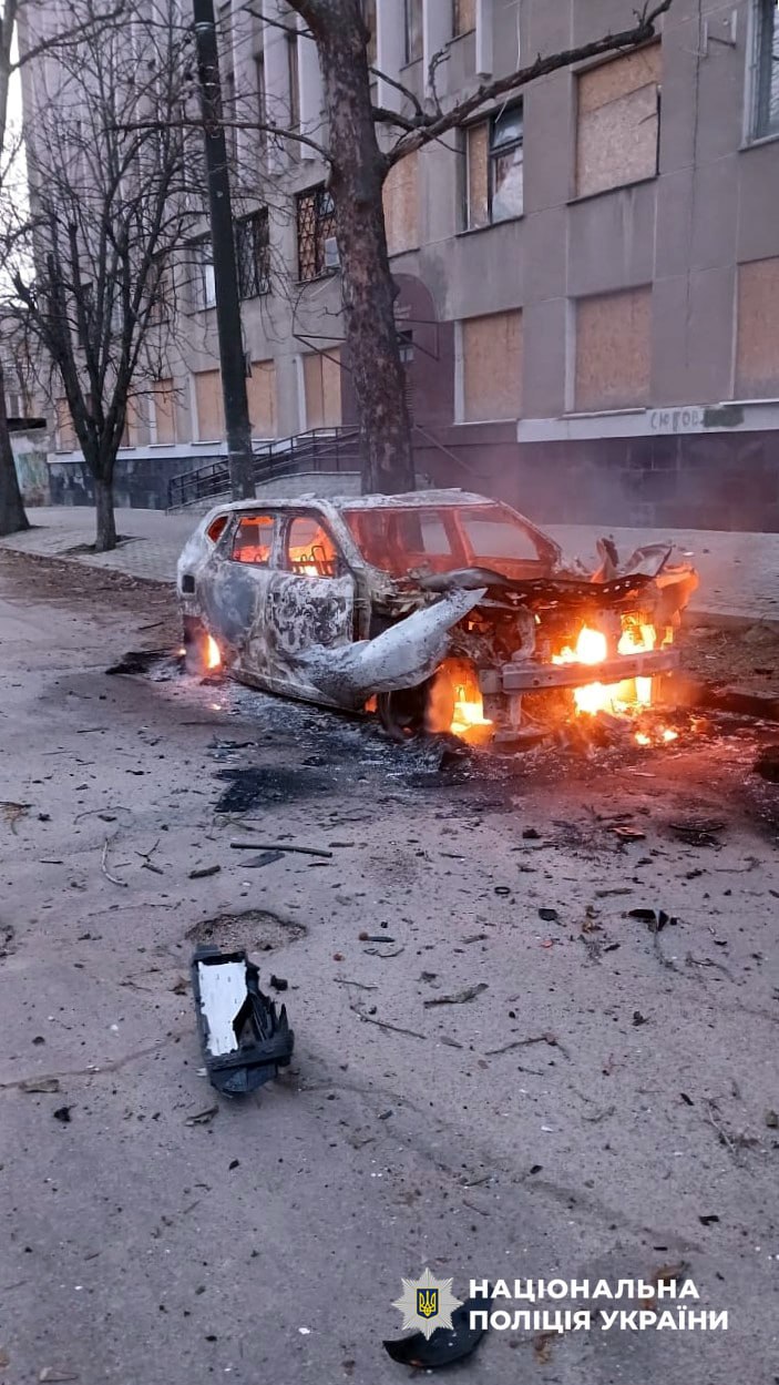 Поліцейського госпіталізували з вибуховою травмою, акубаротравмою та осколковим пораненням чола. За інформацією медиків, загрози його життю немає. Службовий автомобіль знищений вщент.