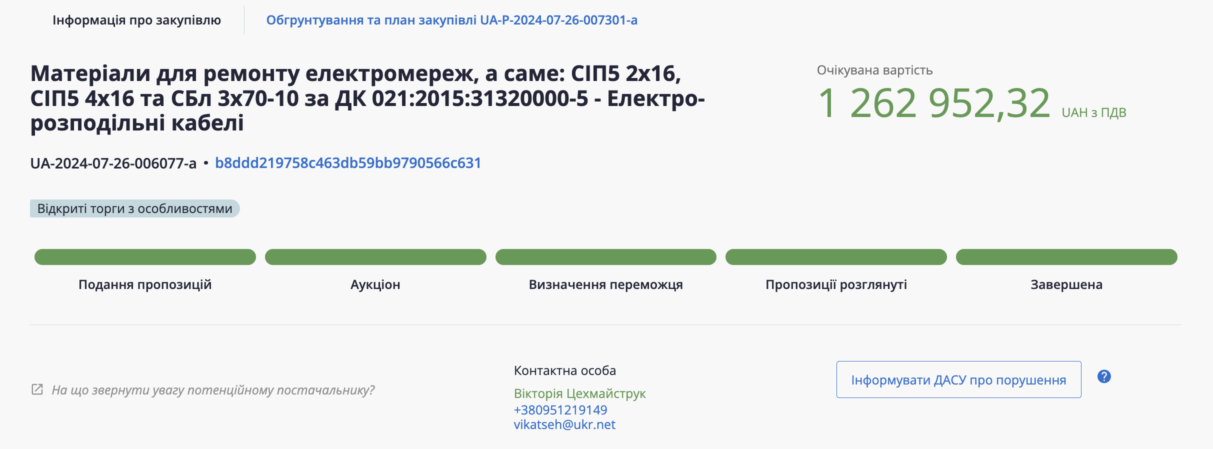 Третій епізод стосується тендеру, який тривав у березні 2024 року. Тоді комунальне підприємство планувало придбати матеріали для ремонту електромереж вартістю 1,7 мільйонів гривень.