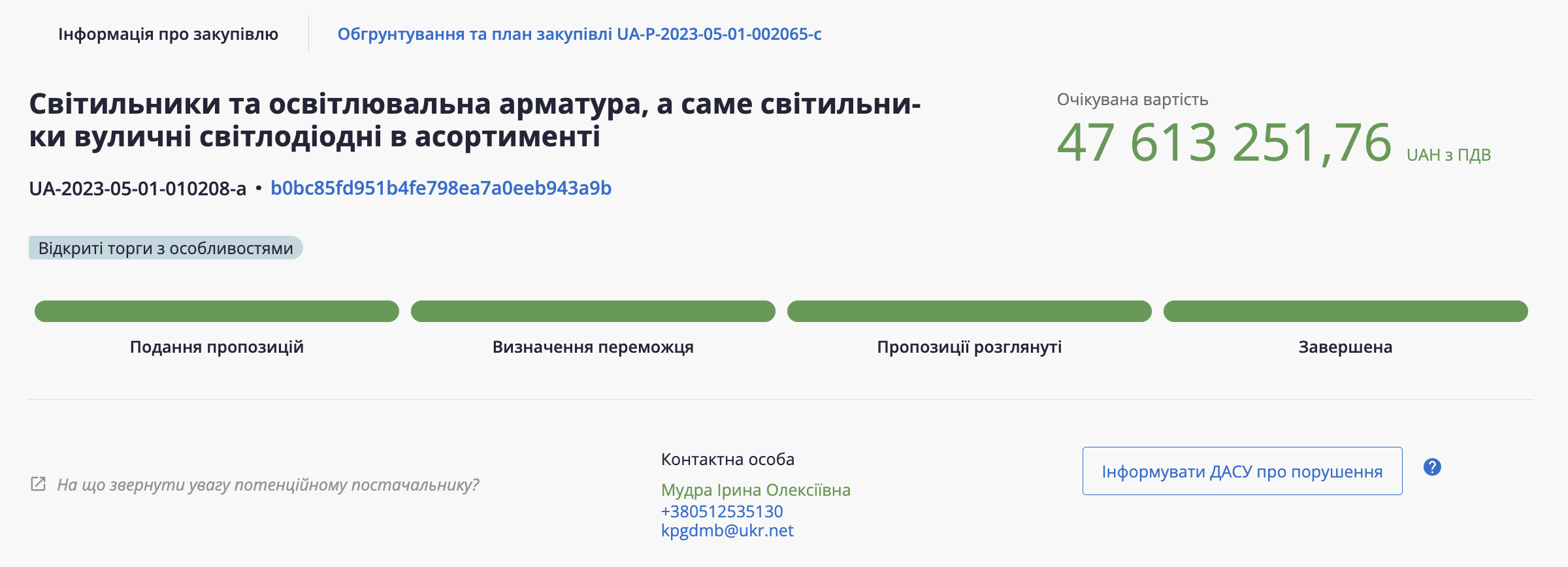 У листопаді 2023 року комунальне підприємство закупало світильне обладнання у кількості 2990 штук, тендер на який був оголошений у листопаді 2023 року з очікуваною вартістю у майже 28 мільйонів гривень.