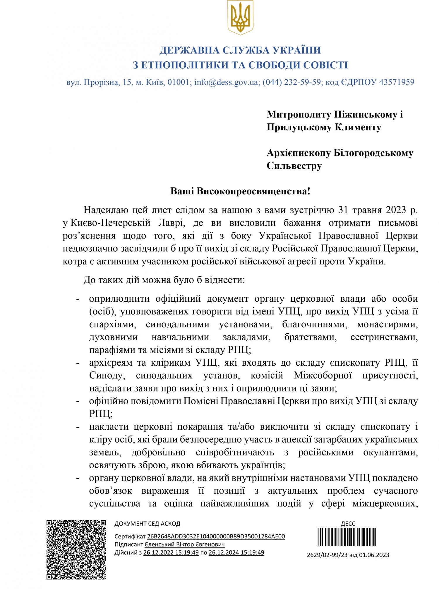 - оприлюднити офіційний документ органу церковної влади або особи (осіб), уповноважених говорити від імені УПЦ, про вихід УПЦ з усіма її єпархіями, синодальними установами, благочиннями, монастирями, духовними навчальними закладами, братствами, сестринствами, парафіями та місіями зі складу РПЦ;