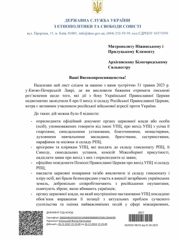 «Члени єпископату УПЦ обіцяли розглянути ці роз’яснення у двотижневий термін. Оскільки відповіді на лист ДЕСС не надійшла ані в двотижневий, ані в трьохтижневий термін, а також враховуючи значний інтерес до цього питання в релігійному середовищі, ДЕСС вважає за можливе оприлюднити лист, який був надісланий представникам УПЦ», — відзначили в держслужбі.