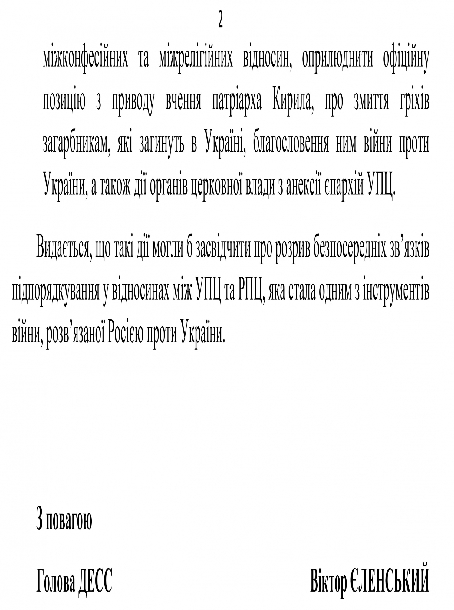 Зазначається, що такі дії могли б засвідчити про розрив безпосередніх зв’язків підпорядкування у відносинах між УПЦ та РПЦ, яка стала одним з інструментів війни, розв’язаної Росією проти України.