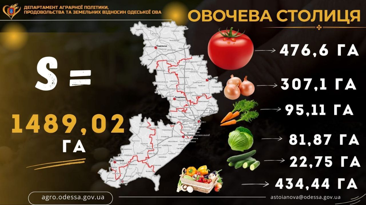 За інформацією чиновниці, цього року в Одеській області посівна площа овочевих культур становить 1489 гектара, з яких 476,6 гектара відведено під томати, 307,1 гектара — цибулю, 95,11 гектара — моркву, 81,87 гектара — капусту, 22,75 гектара — огірки та 434,44 гектара під інші овочеві культури.