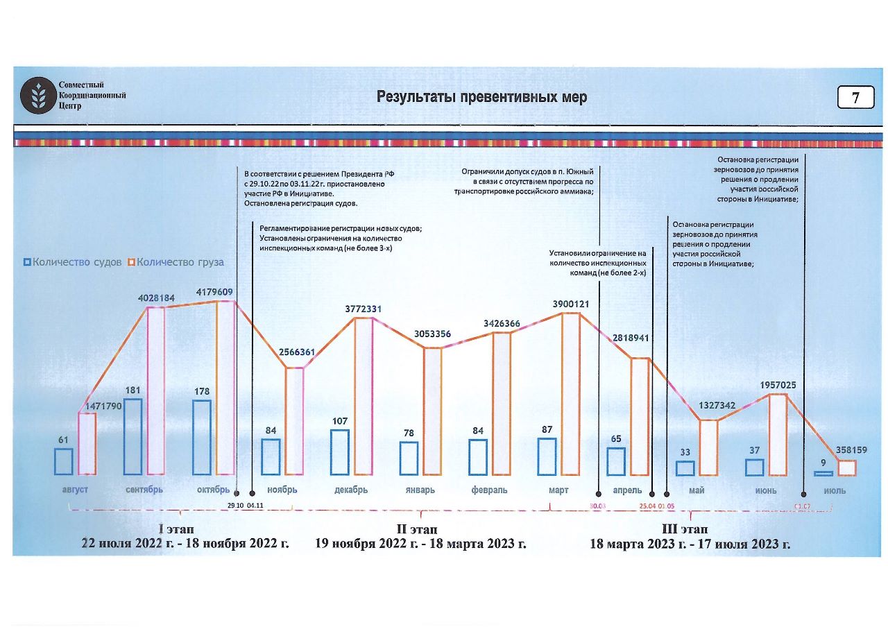 Це дозволило росіянам «ефективно стримувати кількість суден, що прямували в українські порти і значно обмежити об’єм вивезення продовольства з України, що в цілому призвело до неможливості Києвом експортувати близько 20 мільйонів тон вантажів». Росіяни звітують, що найменша кількість продовольства, що експортувалась з українських портів 7,8 мільйонів тон припала на третій етап Ініціативи (з 19 березня до 17 липня 2023).