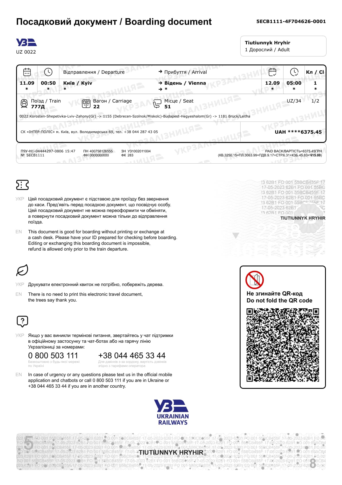 Раніше українська театральна режисерка і громадська діячка Катерина Чепура опублікувала в Facebook скриншот посадкового документа на потяг «Перемишль — Львів» при його поверненні через сервіс «Укрзалізниці».
