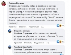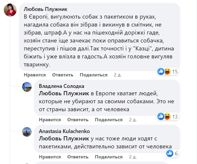 «В Європі вигулюють собак з пакетиком в руках, нагадила собака він зібрав і викинув в смітник, не зібрав, штраф. А у нас на пішохідній доріжці гаде, власник стане, зачекає поки оправиться собачка, переступив і пішов далі. Так точнісінько і у «Казці», дитина біжить і влізла в гидоту. А власник головне вигуляв тваринку», — пише Любов Плужник.