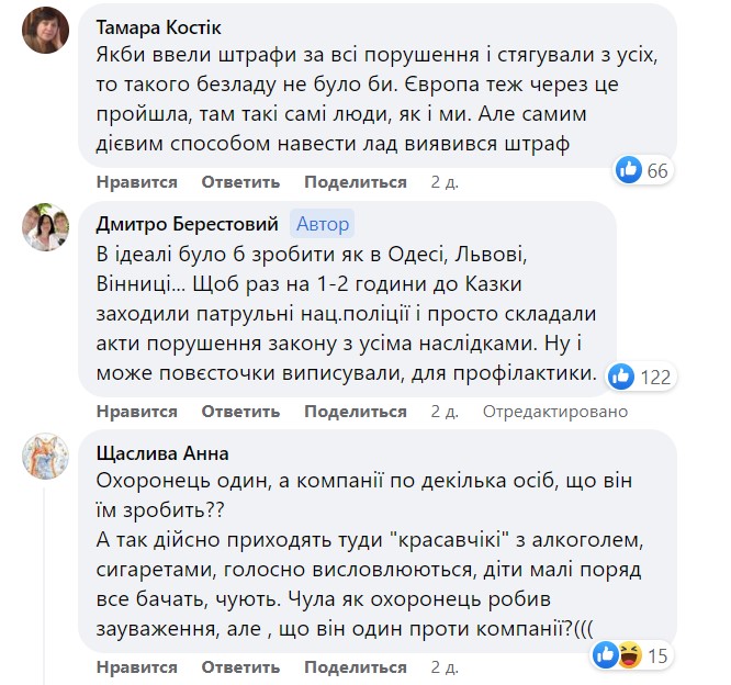 У коментарях під дописом багато миколаївців підтримали ідею заборони алкоголю та тварин на території «Казки». За словами відвідувачів, собаки бігають по всіх майданчиках, а власники не прибирають за ними.