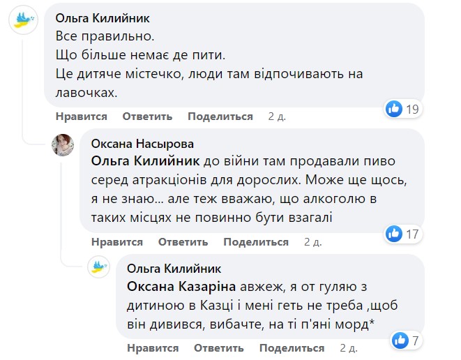 «До війни там продавали пиво серед атракціонів для дорослих. Може ще щось, я не знаю... але теж вважаю, що алкоголю в таких місцях не повинно бути взагалі», -— пише Оксана Насирова.