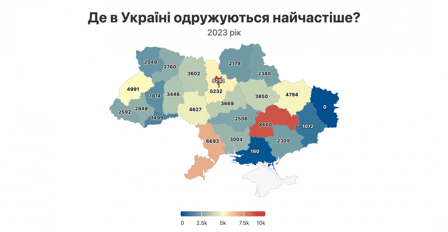 У 2023 році за кількістю шлюбів, як і до повномасштабного вторгнення, лідирує Київ — за пів року у столиці зареєстровано 9292 шлюби.