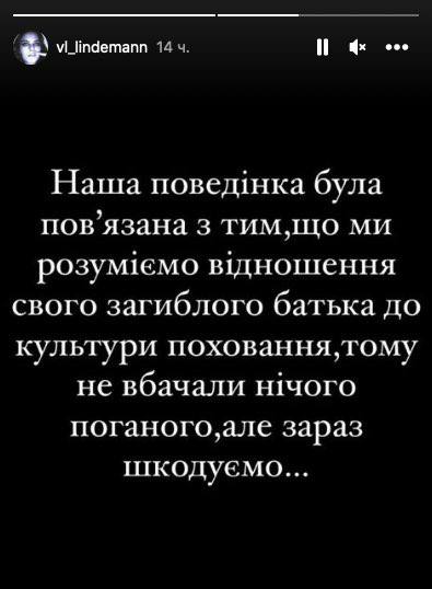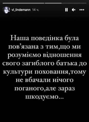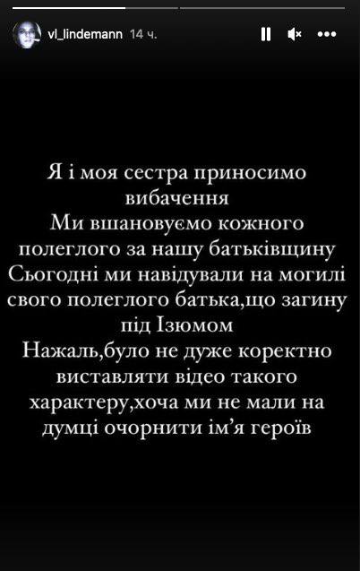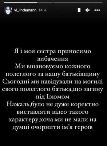У своєму Instagram одна з дівчат написала, що вибачається і шкодує про вчинок. Вона зазначила, що нібито танцювала на могилі свого загиблого під Ізюмом батька, щоб «показати його ставлення до культури поховання».