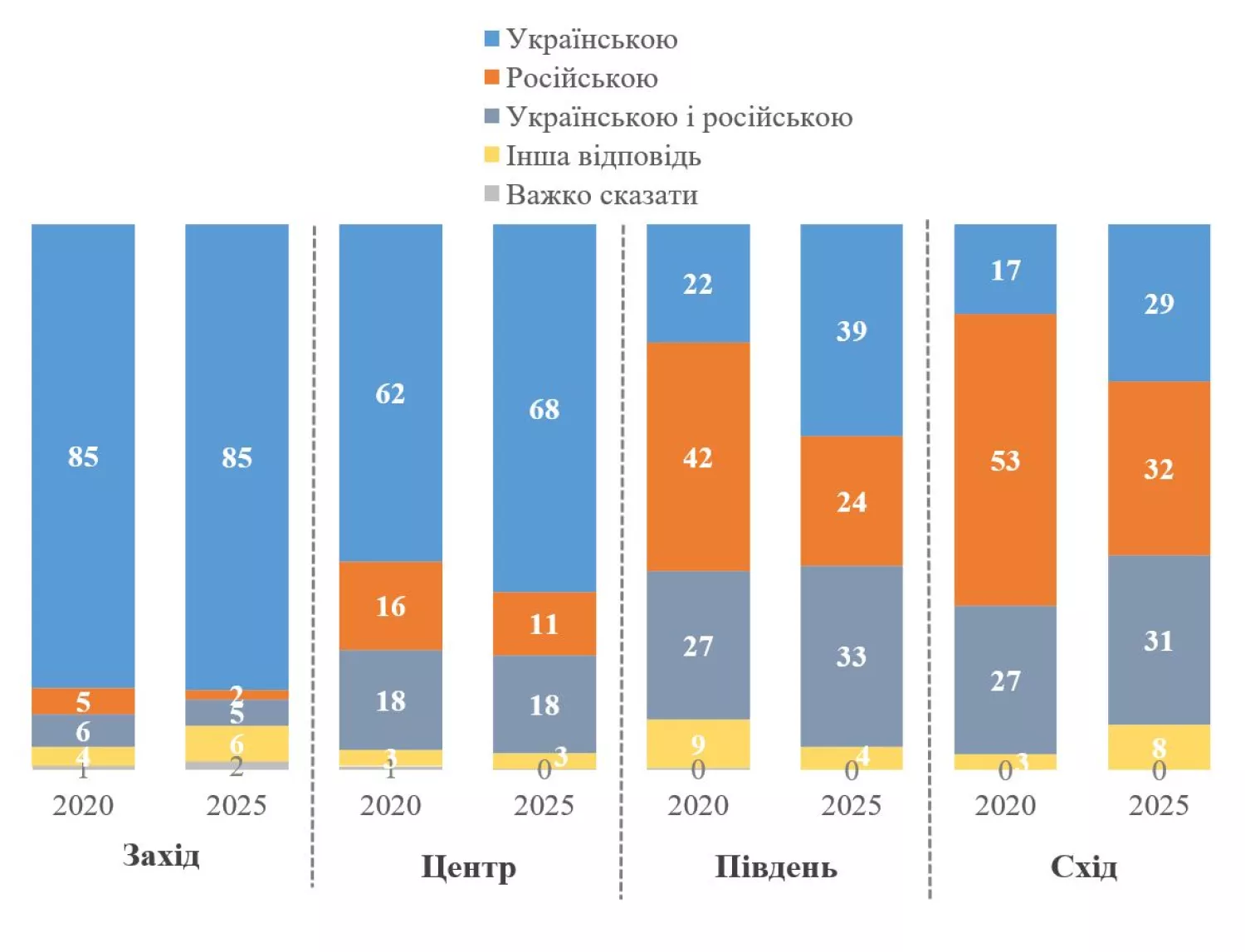 Однак на півдні думки розділилися майже порівну: 51% підтримують викладання російської мови (переважно на рівні інших іноземних мов або нижчому), а 44% виступають проти. Для порівняння, у 2019 році лише 1% мешканців півдня заперечували її вивчення.