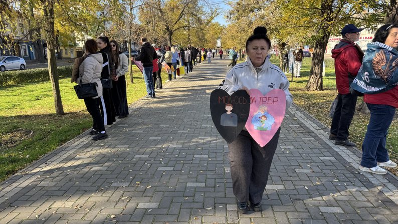 У Миколаєві понад 200 людей вийшли на акцію родин зниклих безвісти та полонених військових. Фото: СуспільнеНа бульварній частині проспекту можна було побачити плакати, прапори бригад і фотографії зниклих бійців. Серед учасниць — Світлана, яка вже кілька місяців шукає свого чоловіка.