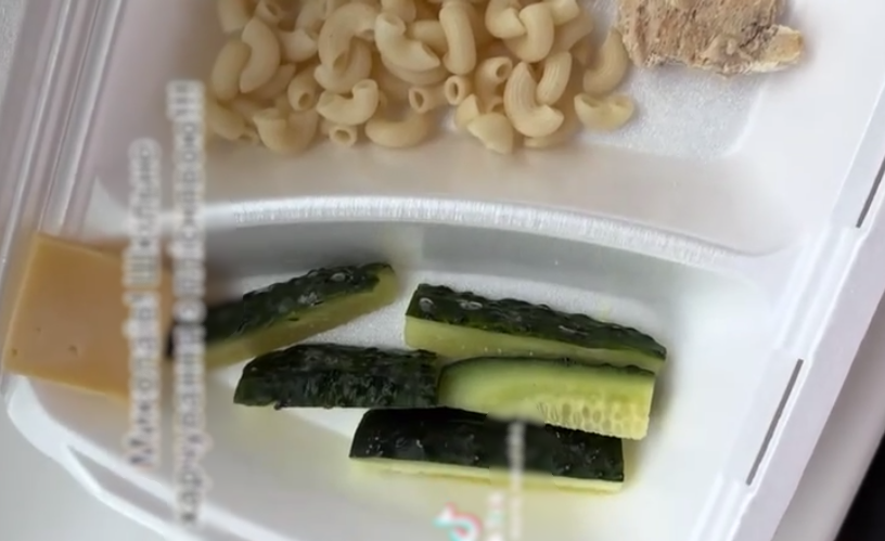 На відео видно стандартний ланчбокс, у якому подали відварні макарони, шматок курки та сиру, а також свіжі огірки з пліснявою.