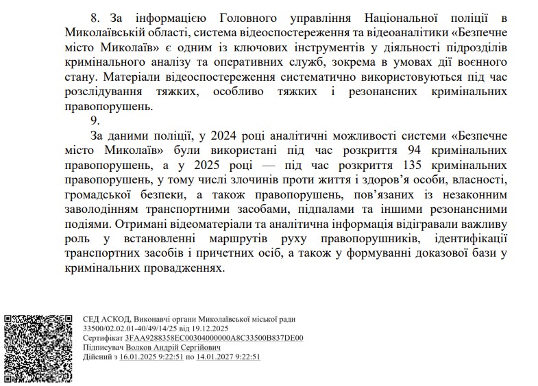 За даними поліції, у 2024 році камери відеоспостереження «Безпечне місто Миколаїв» допомогли розкрити 94 злочини, а у 2025 році — вже 135.