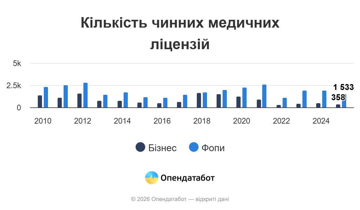 Кількість медичних ліцензій в Україні за роками. Діаграма: ОпендатаботКількість медичних ліцензій в Україні за роками. Діаграма: Опендатабот