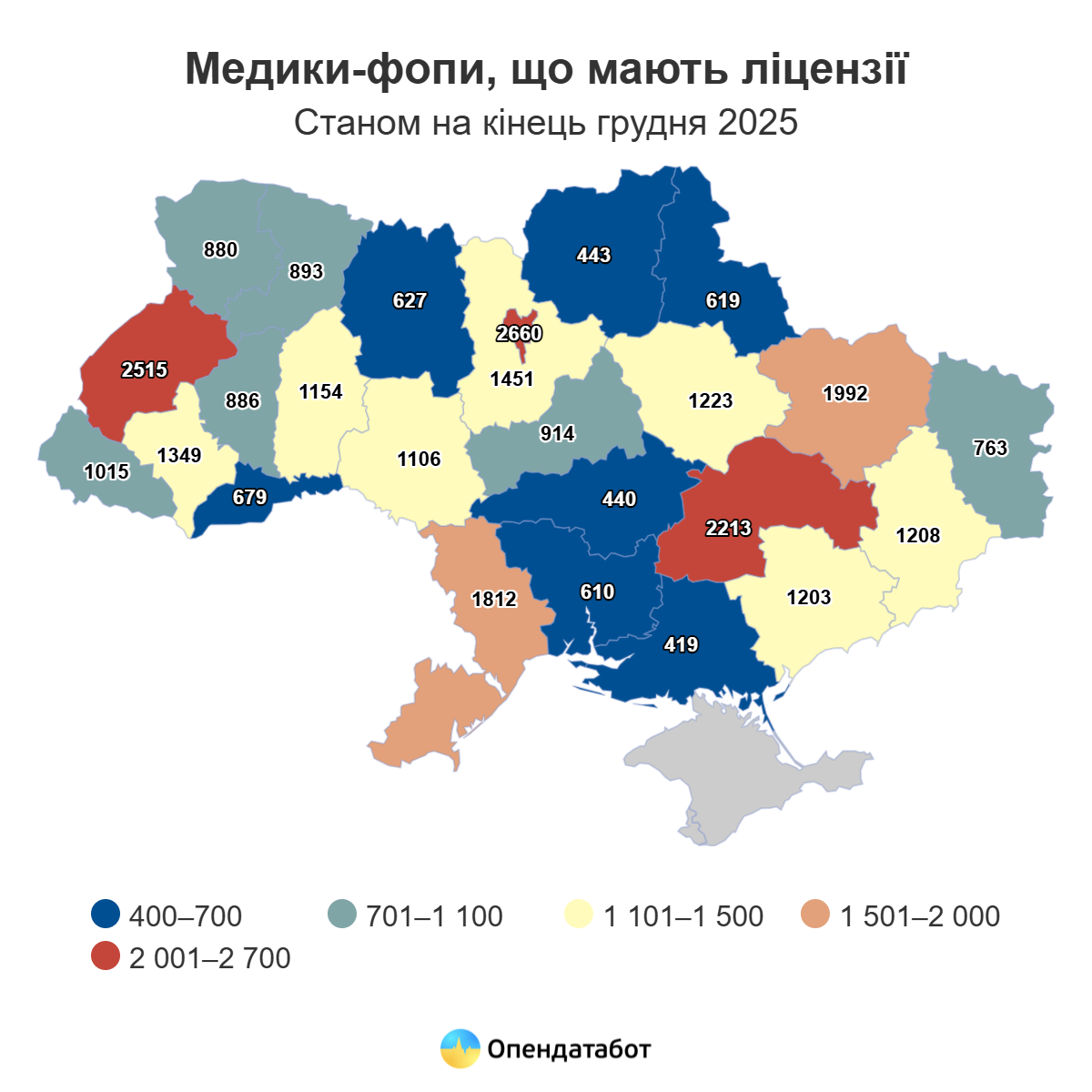 Кількість ліцензованих лікарів-ФОПів за регіонами у 2025 році. Фото: ОпендатаботКількість ліцензованих лікарів-ФОПів за регіонами у 2025 році. Фото: Опендатабот