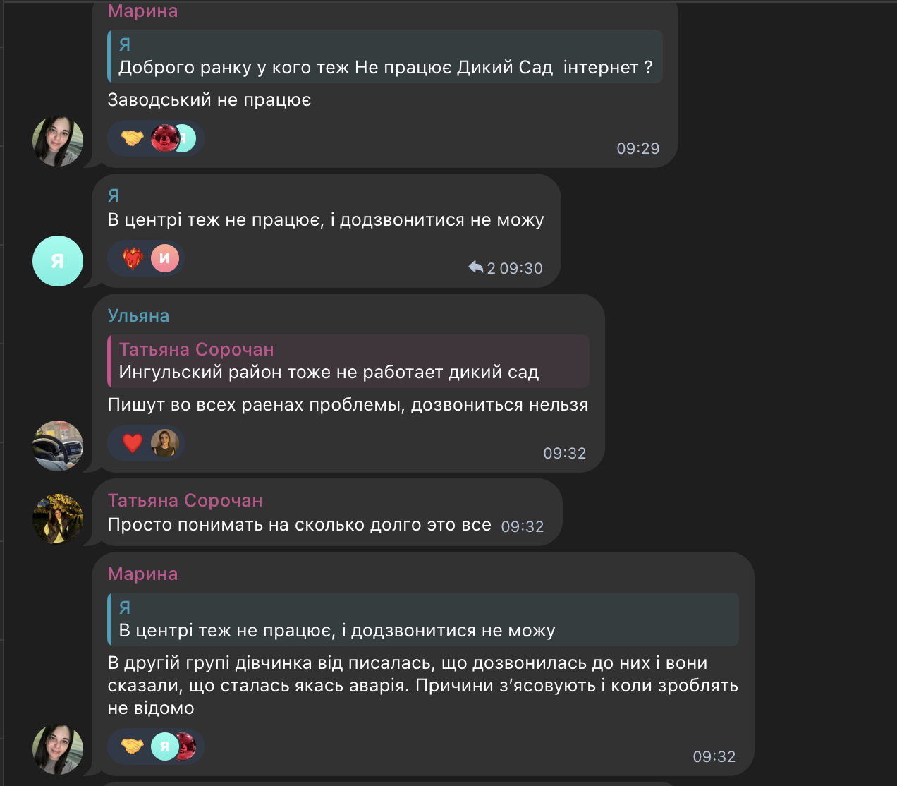 Миколаївці скаржаться на відсутність інтернету та проблеми зі зв’язком в одному з телеграм-чатів. СкриншотиЩе 8 лютого провайдер «Дикий Сад» попереджав абонентів про можливі перебої з інтернетом через тривалі відключення електроенергії та морози. У компанії пояснювали, що низькі температури впливають на роботу акумуляторів — зменшують їх ємність і сповільнюють заряджання, через що зв’язок може зникати в окремих районах.