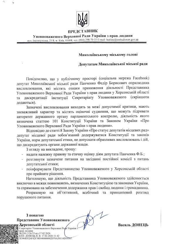 Представник Уповноваженого з прав людини у Херсонській області Василь Донець звернувся до Миколаївської міської ради та міського голови Олександр Сєнкевич зі скаргою на депутата Федора Панченка.