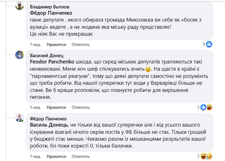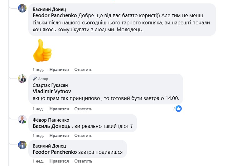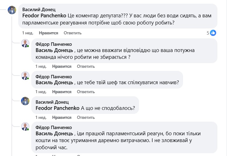 У коментарях між депутатом Федором Панченком та представником Уповноваженого ВРУ з прав людини у Херсонській області Василем Донцем зав’язалася активна дискусія. Федір Панченко у відповідь на критику назвав його ідіотом.