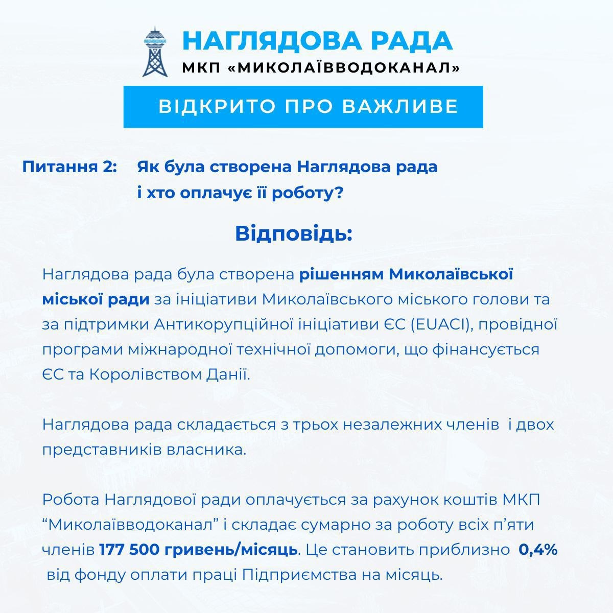 Как известно, Наблюдательный совет КП «Николаевводоканал» — это коллегиальный орган, который осуществляет стратегический контроль за деятельностью предприятия, утверждает ключевые управленческие решения, финансовые планы и оценивает работу руководства. Она не вмешивается в операционную деятельность, влияет на назначение и оценку директора, однако не будет увольнять или нанимать сотрудников на других уровнях.