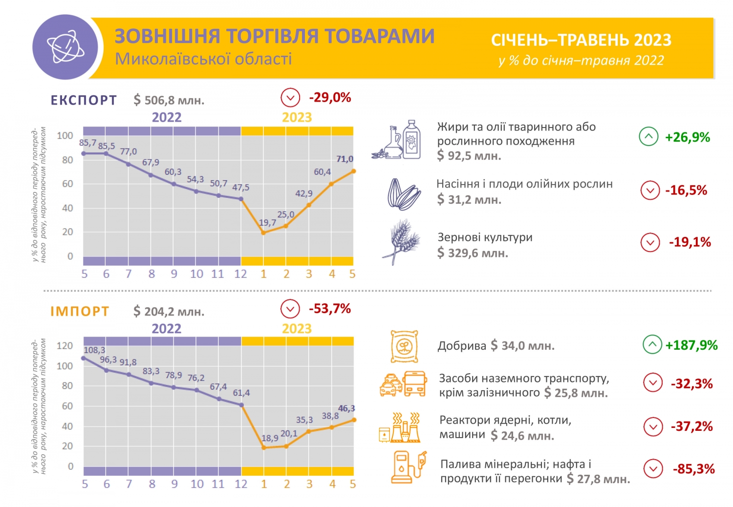 В течение января-мая 2023 Николаевская область экспортировала товаров на 506,8 миллиона гривен. Объемы упали на 29% по сравнению с аналогичным периодом в прошлом году.
