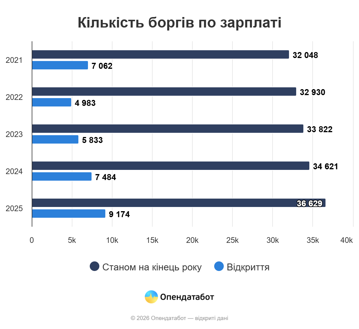 Всего в Украине на данный момент насчитывается 36 629 активных производств из-за задолженности по зарплате — это на 6% больше, чем в прошлом году. В 2025 году компании установили антирекорд: было открыто 9 174 производства против 488 работодателей, что на 30% больше, чем в 2024-м, и является самым высоким показателем за последние пять лет. При этом 56% прошлогодних дел до сих пор не погашены.