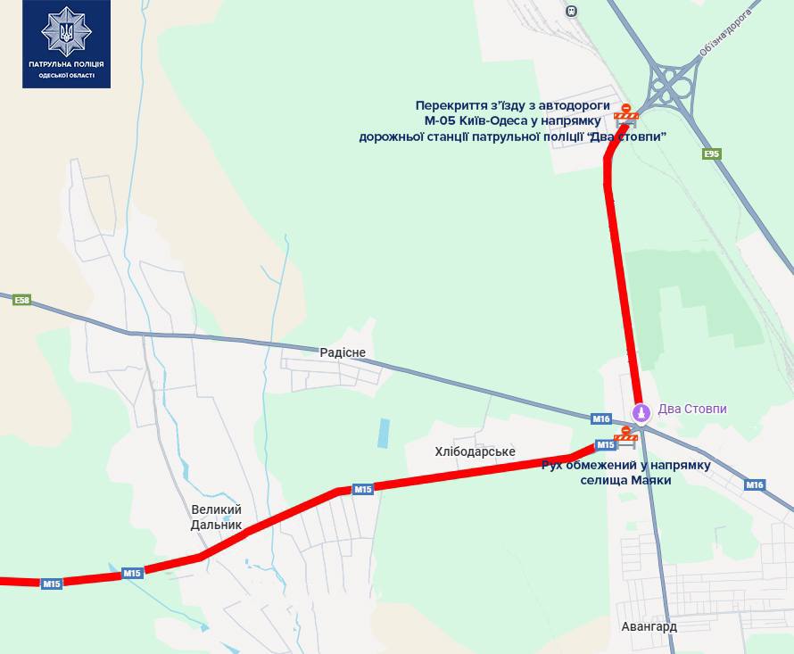 В Службе восстановления и развития инфраструктуры в Одесской области уточнили, что на автодороге М-15 ограничено движение от дорожной станции патрульной полиции «Два Столба» в направлении села Маяки. Объезд транспорта осуществляется по автодороге М-16 в направлении населенного пункта Кучурганы. Также перекрыт съезд с автодороги «Киев-Одесса».