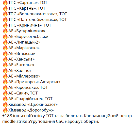 Список уражених об'єктів. Скриншот: Telegram / Роберт БровдіСписок пораженных объектов. Скриншот: Telegram / Роберт Бровди