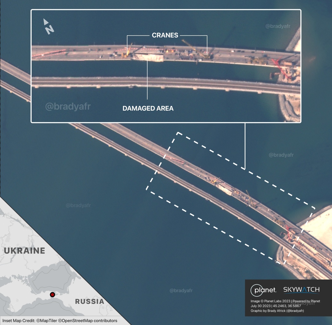 «Текущий ремонт Крымского моста можно увидеть на новых спутниковых снимках Керченского пролива. В прошлом месяце мост был поврежден», — говорится в сообщении к фото.