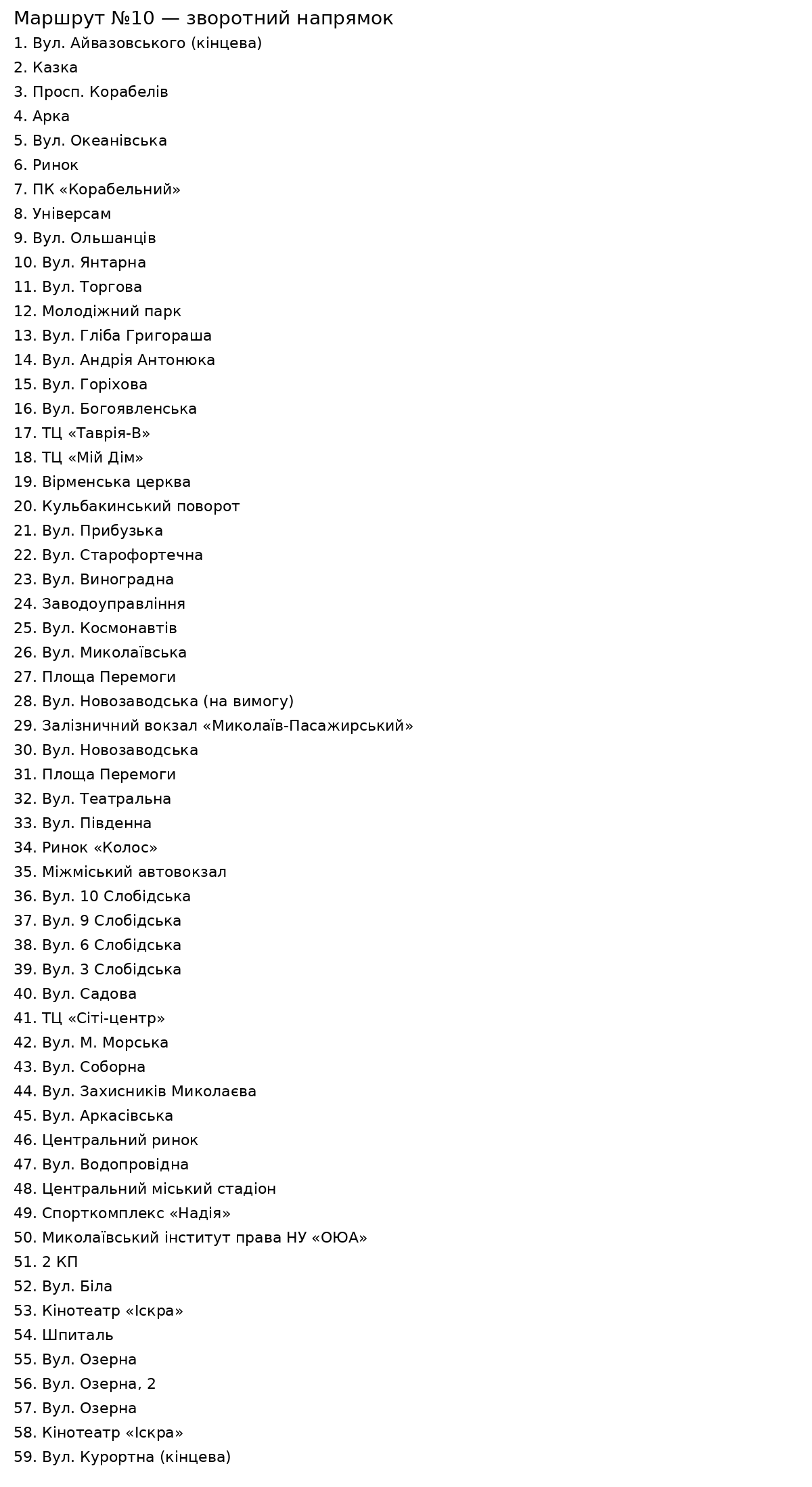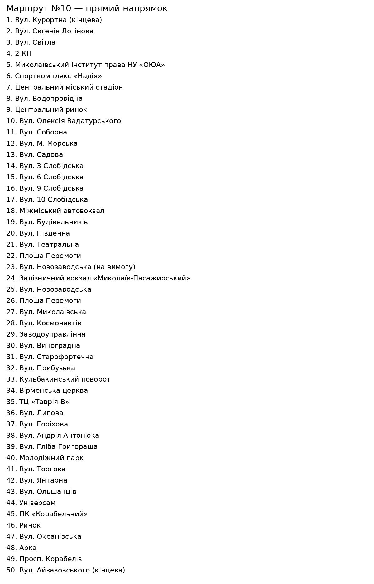- Железнодорожный вокзал «Николаев-Грузовой» — микрорайон Матвеевка (улица Силикатная) до конечной остановки.