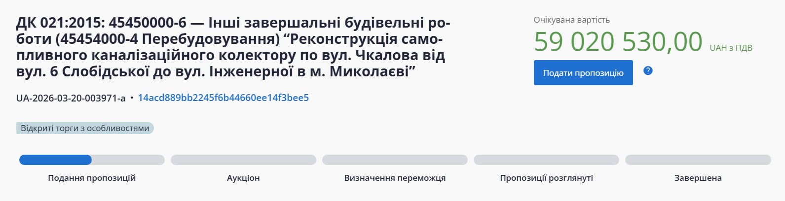 20 марта «Николаевводоканал» объявил тендер на 59 миллионов 20 тысяч 530 гривен. Речь идет о замене существующих железобетонных труб. Единственным участником закупки стало частное предприятие «Эффект», которое предложило выполнить работы за 56 миллионов 50 тысяч гривен.